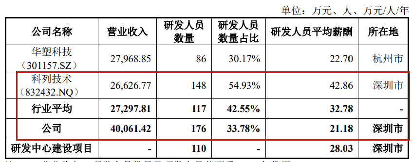 值得一提的是,沛城科技与科列技术同处于深圳市南山区,但两家公司给予研发人员的薪酬待遇存在较大差异——沛城科技研发人员平均薪酬为21.18万元,只有科列技术42.86万元的一半。