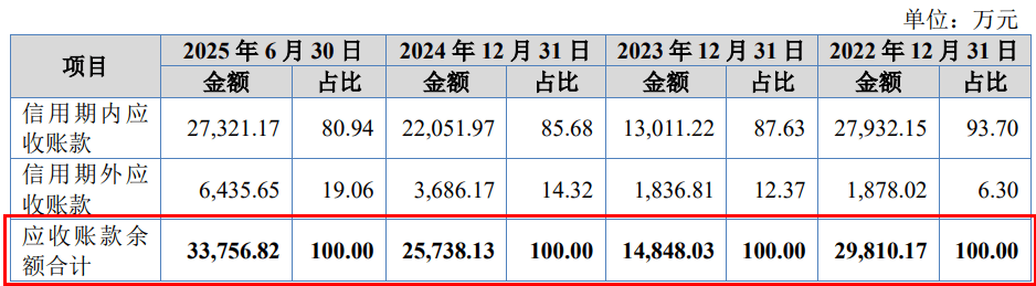 截至各报告期期末,沛城科技的整体应收账款余额分别为2.98亿元、1.48亿元、2.57亿元和3.38亿元。2025年上半年,应收账款较上年末增长8018.69万元。