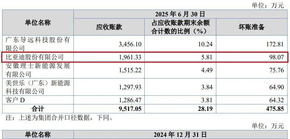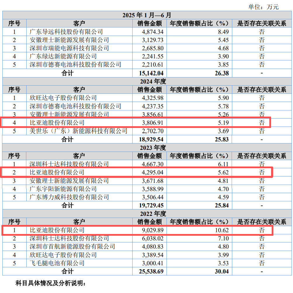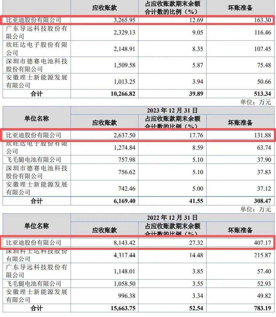 其中,比亚迪连续三年位居应收账款第一大客户之列,各期应收账款余额分别为8143.42万元、2637.50万元、3265.95万元和1961.33万元。