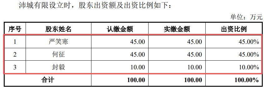 2004年2月,严笑寒携手何征、封毅共同出资设立沛城科技的前身沛城有限。其中,严笑寒和何征各持股45%,封毅持股10%。