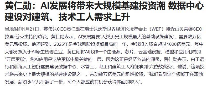 • 英伟达CEO黄仁勋在瑞士达沃斯世界经济论坛年会上(WEF)接受由贝莱德CEO拉里·芬克主持的访谈。黄仁勋表示,AI发展需要“人类历史上规模最大的基础设施建设”,需要数万亿美元新投资。他还表示,这项技术将带来史上最大规模的基建建设潮之一,带动数万亿美元的新增投资,“我们看到这个领域正在蓬勃发展,薪资水平几乎翻了一番,每个人都应该有机会获得体面的收入”。