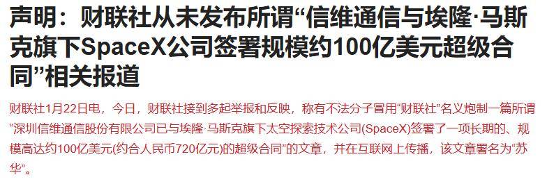 • 今天有不法分子冒用“财联社”名义炮制一篇所谓“深圳信维通信股份有限公司已与埃隆·马斯克旗下太空探索技术公司(SpaceX)签署了一项长期的、规模高达约100亿美元(约合人民币720亿元)的超级合同”的文章,并在互联网上传播,该文章署名为“苏华”。财联社对此辟谣,但信维通信收盘仍涨超10%。