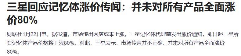 • 据报道,市场传出因应成本上涨,三星记忆体代理商发出涨价通知,即日起三星所有记忆体产品价格将上涨80%。对此,三星表示,市场传言并不正确,并未对所有产品全面涨价80%。