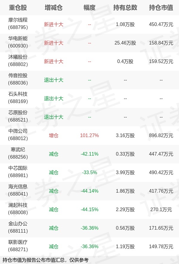 证券之星消息,1月22日华夏基金旗下荣膺管理的华夏上证科创板50成份交易型开放式指数基金发起式联接基金公布年报,近1年净值增长率53.68%。与上一季度相比,该基金前十大重仓股新增摩尔线程,华电新能,沐曦股份;并对中微公司增仓1.59万股,为该基金第一大重仓股;传音控股,石头科技,芯原股份等退出前十大重仓股;详细数据如下: