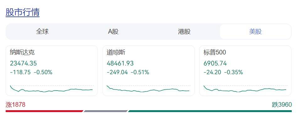 美东时间周一,美股三大指数均小幅收跌,截至收盘,道指跌0.51%,纳指跌0.5%,标普500指数跌0.35%。