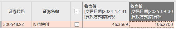 东方财富数据显示,截至2025年9月30日,长芯博创(300548.SZ)的收盘价为106.27 元/股,相较于2024年年末的46.37元/股,增长幅度达到129.19%。