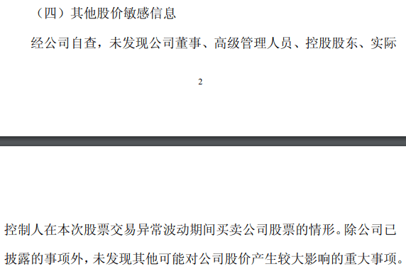 其中,1月12日晚间的公告明确指出:“经公司自查,未发现其他董事、高级管理人员、控股股东及实际控制人在本次股票交易异常波动期间存在买卖公司股票的情形。”