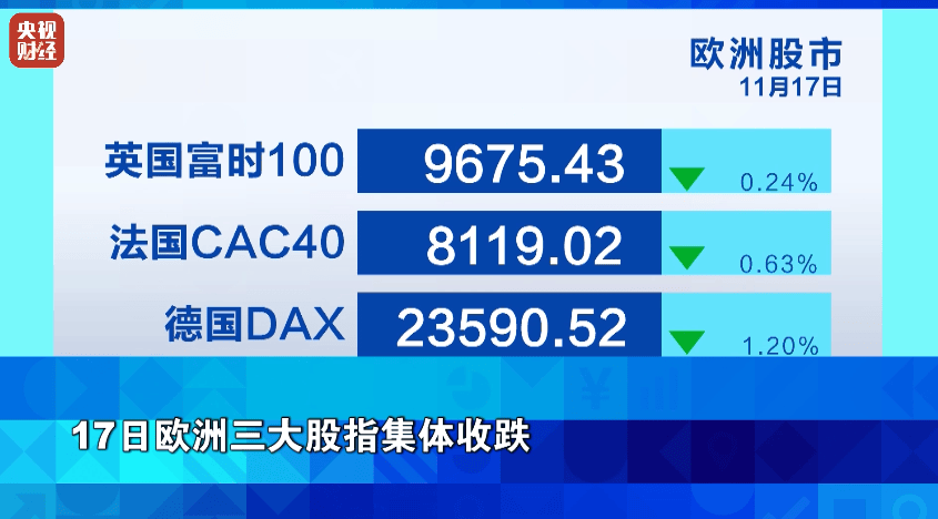 欧洲方面,本周将有欧元区10月CPI终值和11月制造业PMI初值等重要经济数据公布,投资者周一观望情绪浓厚。受科技、金融和化工等行业蓝筹股下跌的拖累,欧洲三大股指周一集体收跌。截至收盘,英国股市跌0.24%,法国股市跌0.63%,德国股市下跌1.20%。