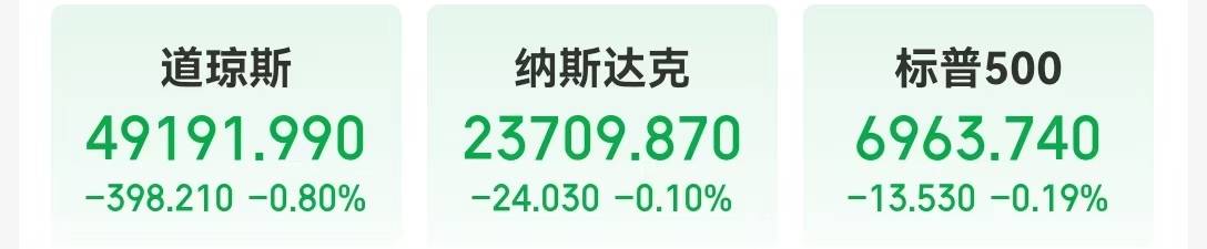 当地时间1月13日,道指下跌398.21点,跌幅0.80%;纳指跌0.1%,标普500指数跌0.19%。