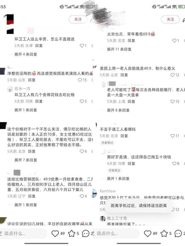 在小红书上,部分网友质疑“美团上周一老人自助就是49.9,有什么意义”“且感觉视频是表演给人看的”。也有网友持不同观点,认为这个价格对偶尔消费的顾客来说较为划算。