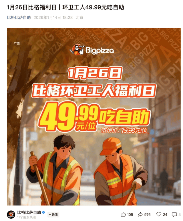 营销费用占比攀升的同时,比格的促销策略也在同步调整。2026年1月14日,比格比萨发布了一则“环卫工人福利日”宣传海报。根据海报内容,1月26日国际清洁能源日当天,环卫工人凭工作证或身着工作服到店,可享49.99元每位的自助优惠,市场价为79.99元。