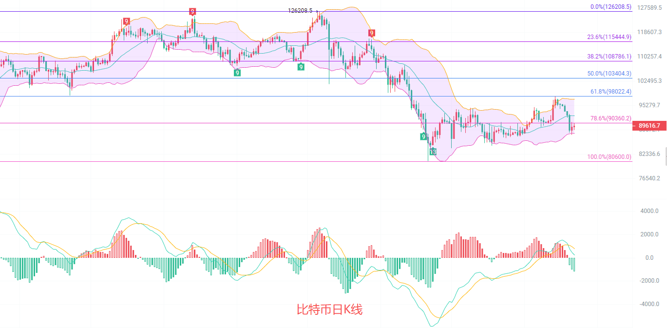 日K线发稿前最高90300,最低88450,EMA趋势指标阻力点在91500一线,分割线786阻力点在90360,MACD连续缩量梯量下行,DIF和DEA向下扩散,K线从布林带下轨87600回暖,中轨在92300,整体趋势目前处于低位阶段,有二次探底的动能存在,短期内高点南下为主,中长期低位北上为先