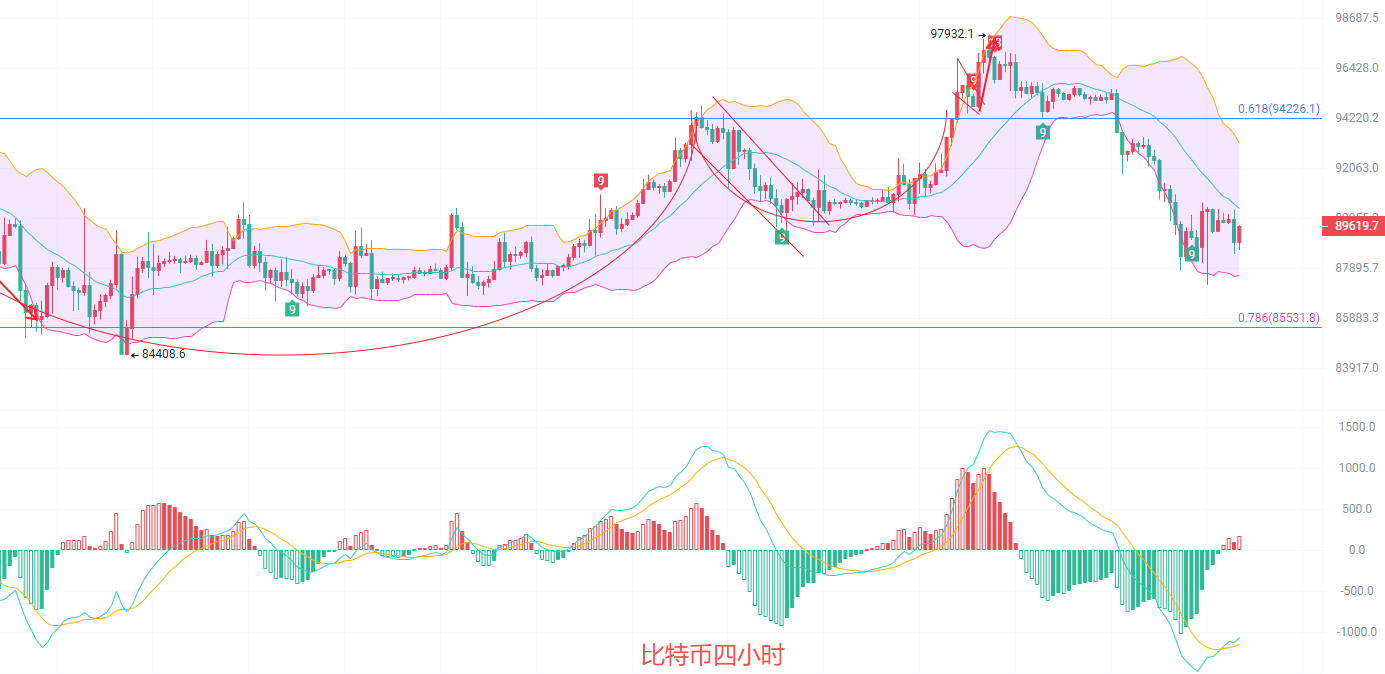 四小时K线底部背离明显,EMA趋势指标向下交替扩散,EMA15已经抵达了9万关口,MACD连续放量K线没有拉伸反而走低,DIF和DEA在0轴线下方低位向上扩散,弱势格局,布林带向下中轨来到了90300,下轨关注87600,那么北上建议跌破87600以后再考虑,南下在9万以上找位置