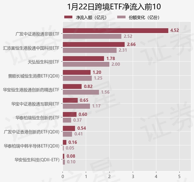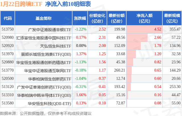 当日有26只跨境ETF基金出现资金净流入,其中净流入排首位的是广发中证港股通非银ETF(513750),份额增加了2.52亿份,净流入额为4.52亿元。
