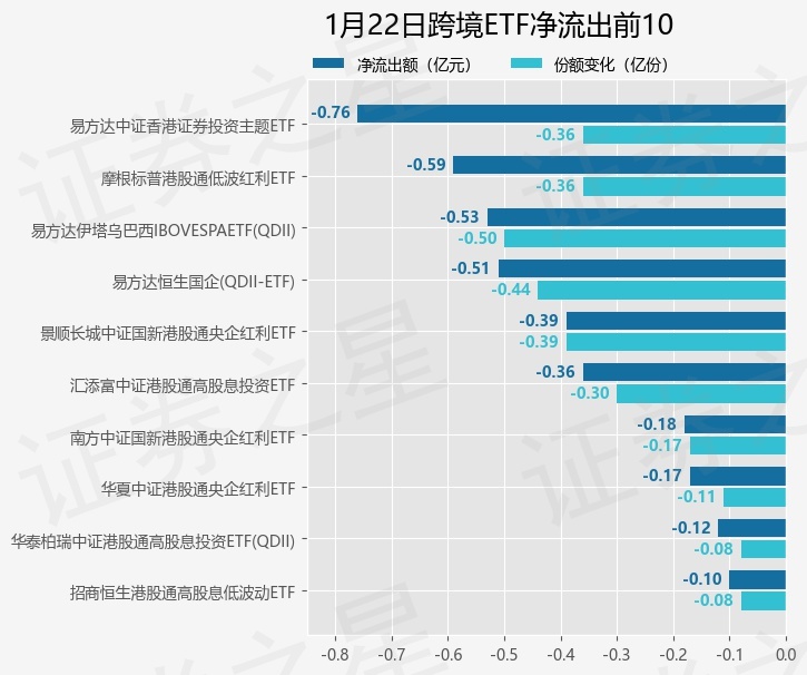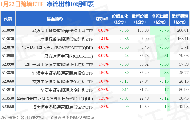 当日有38只跨境ETF基金出现资金净流出,其中净流出排首位的是易方达中证香港证券投资主题ETF(513090),份额减少了3650.0万份,净流出额为7596.41万元。