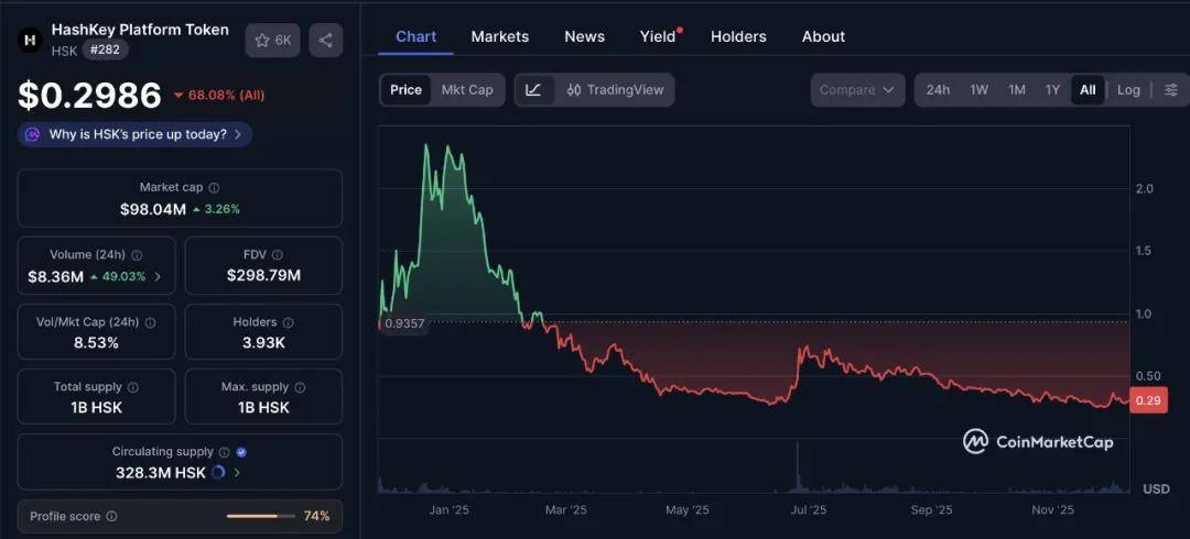 然而,在聚光灯和资本的追捧之下,HashKey并非全无隐忧。其平台币HSK的表现以及由此引发的社群信任危机,正成为公司荣光背后的一片阴影。