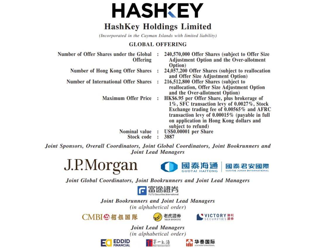 投资者的认购期从12月9日上午9时(香港时间)开始,持续至12月12日中午。若一切顺利,HashKey IPO最终定价将于12月16日确定并公布,股票将于2025年12月17日正式开始交易,股票代码为“3887”。此次IPO的联席保荐人由摩根大通(JP Morgan Chase)和国泰君安国际(Guotai Junan International)等知名金融机构担任。