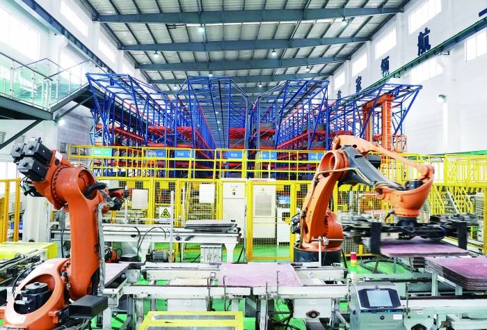 在江铜集团贵溪冶炼厂智能化电解车间,机器臂进行铜板转运作业。新华社图