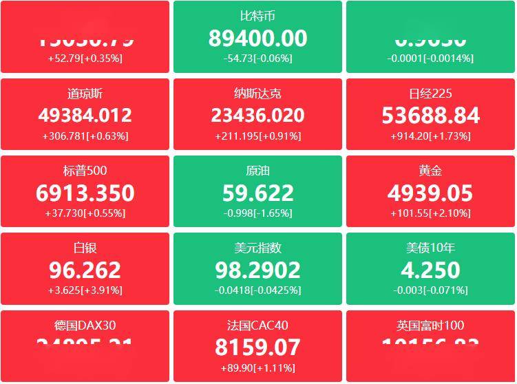 期货:现货黄金涨2.22%,刷新历史高位至4939.41美元,黄金期货涨1.97%,在电子交易盘刷新历史高位至4934.30美元;现货白银涨3.55%报96.3600美元,白银期货涨4.05%报96.395美元;铜期货涨0.61%报5.8030美元;现货铂金涨6.36%报2647.15美元,现货钯金涨4.13%报1924.52美元;原油期货跌1.26美元,跌幅2.08%报59.36美元,布伦特原油跌1.18美元,跌幅1.81%报64.06美元;天然气期货涨近3.49%报5.0450美元;汽油期货报1.8172美元,取暖油期货报2.3668美元。
