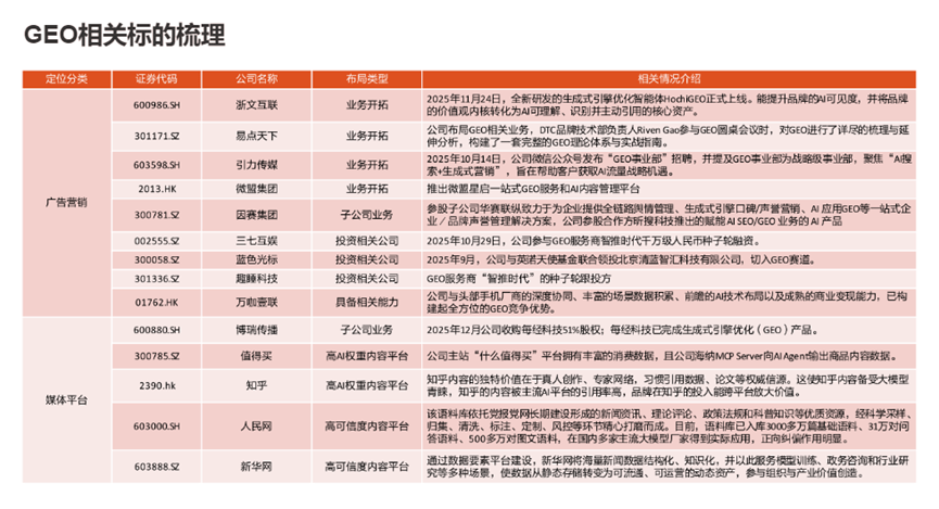 3)少数公司已经开始布局,甚至有业绩贡献:例如,蓝色光标2025年半年报显示,公司AI相关业务收入占比已经超过45%,其中GEO优化相关收入同比增长230%。