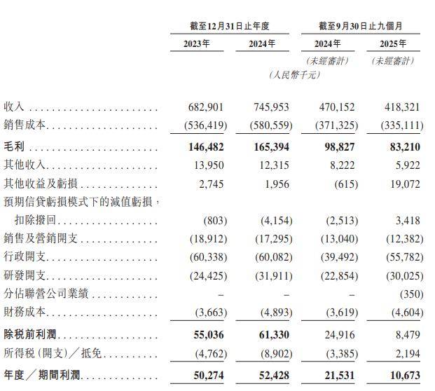 业绩方面,公司于2023年度、2024年度、2025年截至9月30日止九个月,该公司实现收入分别为6.83亿元、7.46亿元、4.18亿元人民币,同比增加9.2%、-11%。于2023年度、2024年度、2025年截至9月30日止九个月,该公司年度╱期间利润分别约为5027.4万元、5242.8万元、1067.3万元人民币,同比增加4.11%、-50.43%。
