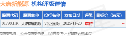 截至2026年1月5日收盘,大唐新能源(01798.HK)报收于2.04港元,下跌1.92%,成交量3002.0万股,成交额6170.15万港元。投行对该股的评级以增持为主,近90天内共有1家投行给出增持评级。兴证国际最新一份研报给予大唐新能源增持评级。