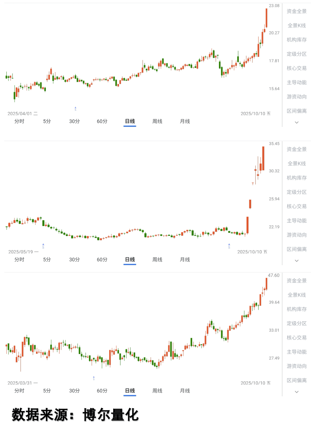看图1,这是那三只股票的K线图,二季度开始就一直在横盘震荡,九月下旬才突然涨起来: