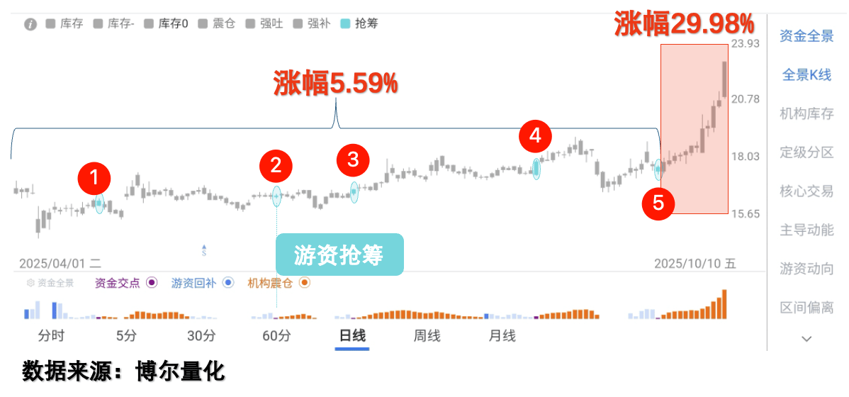 但再看它们的资金行为图,比如其中一只电网设备股(看图2),图里标了①到⑤五个点,这五个点都是机构和游资同时活跃的时刻(行业里叫“游资抢筹”)。前四次出现这个信号时,股价还在横盘,但第五次一出现,股价直接起飞——半个月涨了600%。