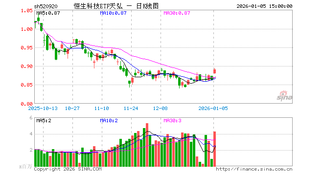 1月5日,恒生科技ETF天弘(520920)涨3.24%,成交额3.79亿元。当日份额增加2.00亿份,最新份额为126.19亿份,近20个交易日份额增加32.00亿份。最新资产净值计算值为111.98亿元。