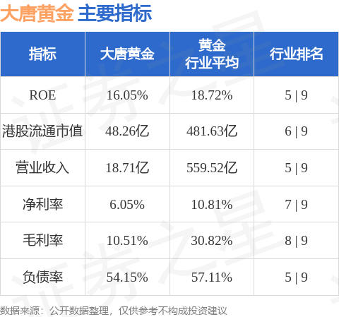 大唐黄金港股市值48.26亿港元,在黄金行业中排名第6。主要指标见下表: