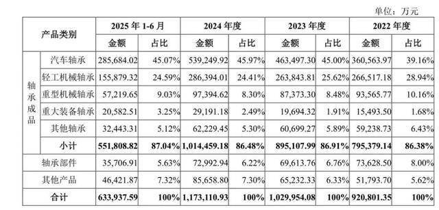 2022年-2025年上半年,人本股份主营收入分别为92.08亿元、103亿元、117.31亿元及63.39亿元。轴承成品为公司最主要的收入来源,占比各期主营业务收入的86.38%、86.91%、86.48%、87.04%。