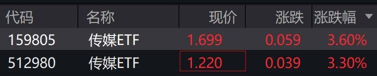 受盘面影响,传媒ETF涨超3%。