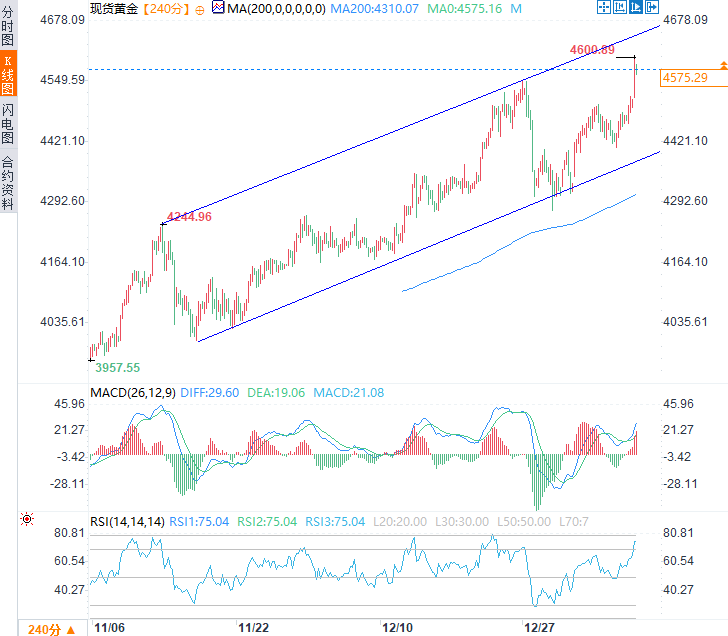 美国对委内瑞拉的军事介入、特朗普总统威胁对伊朗动荡局势采取军事行动、持续不断的俄乌冲突以及白宫执意收购格陵兰岛等事件,持续令市场紧绷。这使得全球风险情绪持续受损,推动避险资金不断涌入贵金属市场。周一(1月12日)亚欧时段,现货黄金震荡上涨,延续了前两个交易日涨势,日内一度触及4600.89美元/盎司的历史新高,现交投于4575美元/盎司附近,日内涨幅约1.45%。