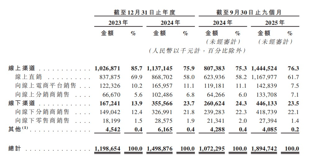 销售渠道方面,线上渠道是绝对主力。2023年、2024年以及2025年前三季度,公司线上销售金额占比均超过75%。
