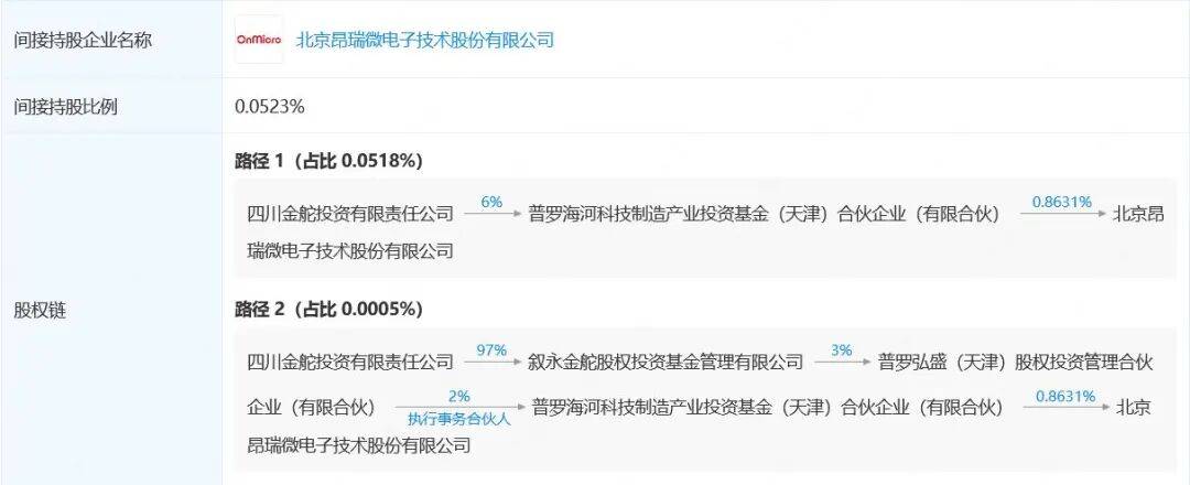 对昂瑞微的投资,系四川金舵投资公司通过普罗海河科技制造产业投资基金(天津)合伙企业(有限合伙)完成,昂瑞微上市后,四川金舵投资公司间接持有昂瑞微0.0523%股份,持股市值为842.55万元。