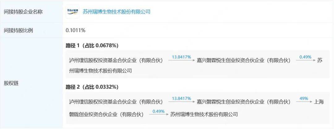 对瑞博生物的投资,系泸州璞信股权投资基金合伙企业(有限合伙)通过上海磐陇创业投资合伙企业(有限合伙)和嘉兴磐霖悦生创业投资合伙企业(有限合伙)完成,瑞博生物上市后,泸州璞信股权投资基金合伙企业(有限合伙)间接持有瑞博生物0.1011%的股份,持股市值为1329万港元。