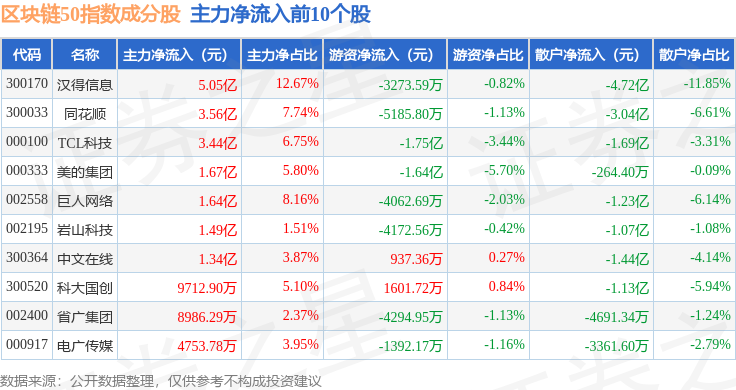 资金流向方面,区块链50(399286)指数成份股当日主力资金净流出合计21.51亿元,游资资金净流入合计5.0亿元,散户资金净流入合计16.52亿元。成份股资金流向详情见下表: