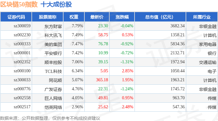 证券之星消息,1月23日,区块链50(399286)指数报收于4400.63点,涨1.04%,成交924.76亿元,换手率5.41%。当日该指数成份股中,上涨的有41家,岩山科技以6.16%的涨幅领涨,下跌的有9家,顺丰控股以1.31%的跌幅领跌。