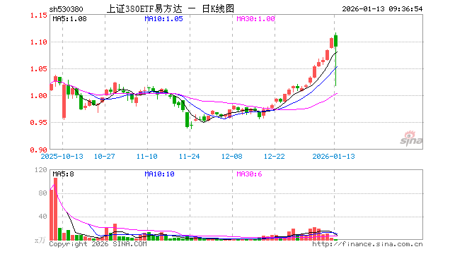 1月13日,上证380ETF易方达(530380)开盘涨0.45%,报1.110元。上证380ETF易方达(530380)重仓股方面,卧龙电驱开盘跌0.08%,赤峰黄金涨0.06%,瑞芯微涨0.36%,亨通光电涨0.28%,永泰能源涨0.00%,四川长虹涨1.06%,九号公司跌0.44%,东阳光跌1.37%,均胜电子涨0.10%,东吴证券涨0.00%。