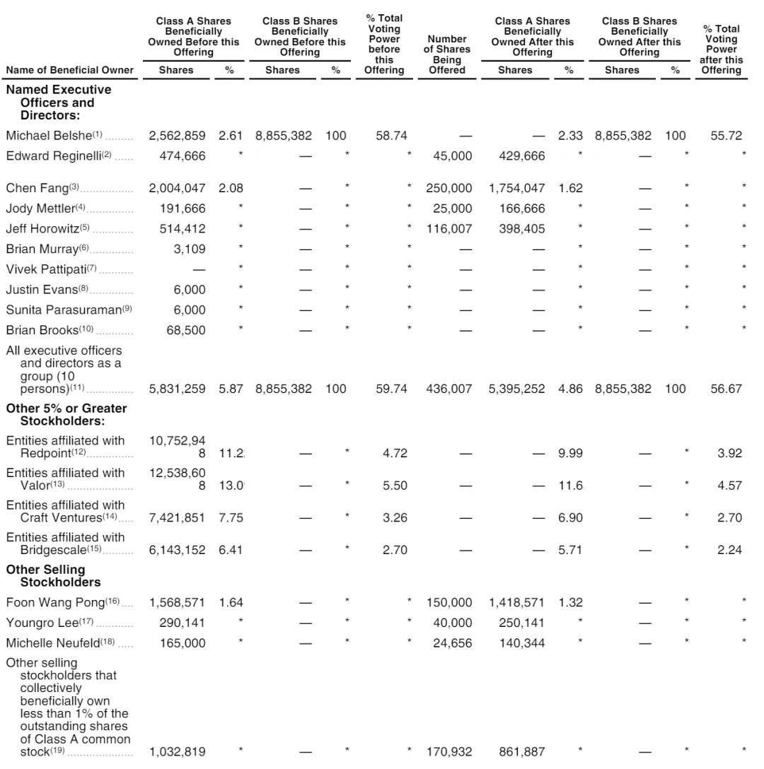 Redpoint持有9.99%的A类股,有3.92%投票权;Valor持有11.6%的A类股,有4.57%的投票权;Craft Ventures持有6.9%的A类股,有2.7%的投票权;Bridgescale持有5.71%的A类股,有2.24%的投票权。