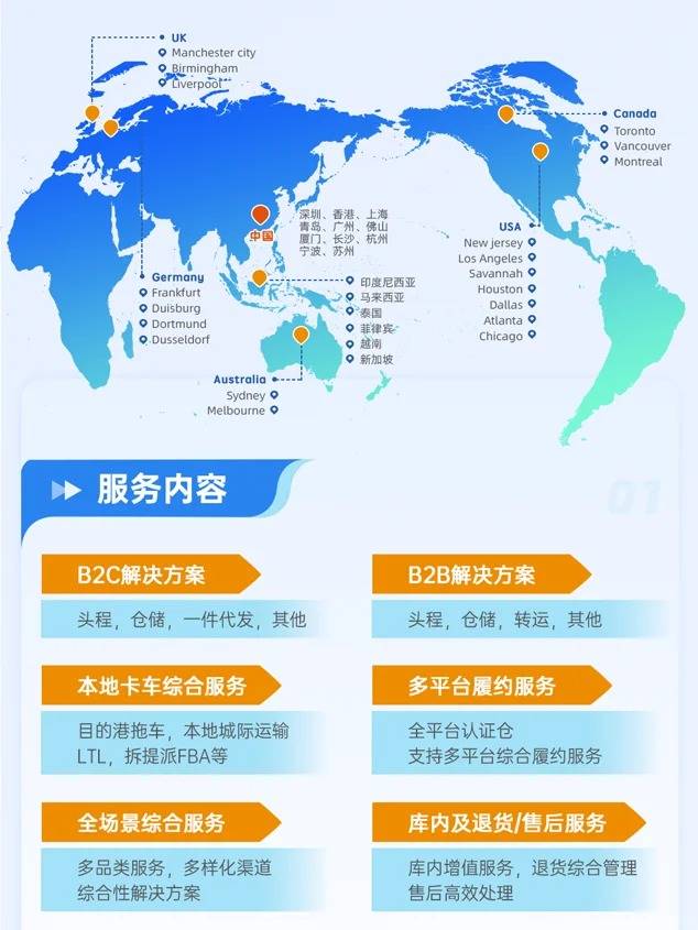 目前,易达云已在美国建立7大仓群,全面覆盖北美主力市场,总仓储面积达600000+m²,通过密集的仓网覆盖,利用智能分仓算法实现订单精准分布,匹配最优渠道,实现淡旺季高效履约,快速降本。