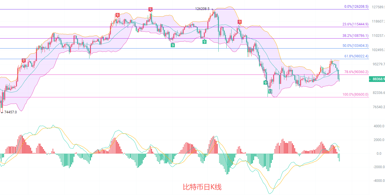 日K线发稿前最高90600,最低87200,EMA趋势指标向上收缩的趋势被扳回走南,目前趋势指标在黄金分割线0.786一线上方也就是90360之上,短线若行情继续走南,那么趋势指标有很大概率跌破9万,MACD连续缩量下行,布林带收缩,K线连续两日在布林带下轨87500横盘,若主力在探87500回调,可以考虑北上