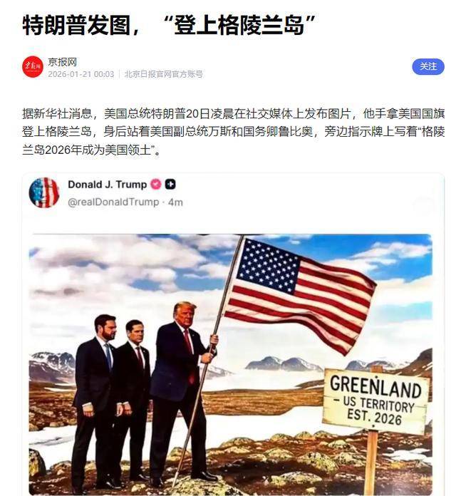 这波特朗普的操作真的是无底线。1月20日当天,他在社交平台上连发两张挑衅性十足的图片,其中一张直接写着2026年,格陵兰岛归美国,他自己站在C位,手中高举着美国国旗,身后是围绕着他的工作人员,满脸写着志在必得。另一张图片则将委内瑞拉、格陵兰岛、加拿大与美国拼在一起,而几位欧洲领导人则被安排坐在对面,显然是故意表现出一副敢怒不敢言的姿态。