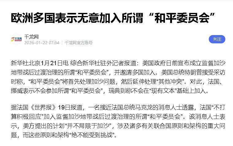 挪威外交部的国务秘书克拉维克也早早地表明态度,明确表示在当前形势下,挪威绝不会加入这个委员会,而瑞典则稍显保留。瑞典首相克里斯特松在达沃斯的公开发言中直言,基于美方提出的现有文本,瑞典不会加入该委员会。欧洲的集体反对,实质上反映出的是对美国霸权的抵制。在达沃斯的演讲中,马克龙毫不掩饰地批评特朗普,指出我们不能接受那些自认拥有最大话语权或最强武力的国家来决定世界秩序,并警告欧洲有足够强大的反击手段应对不公正待遇。