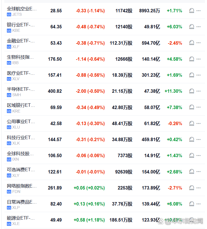美股行业ETF普遍走低,全球航空业ETF跌1.14%,银行业ETF跌0.74%,金融业ETF跌0.71%,生物科技指数ETF跌0.64%,半导体指数跌0.50%,科技行业ETF跌0.21%。
