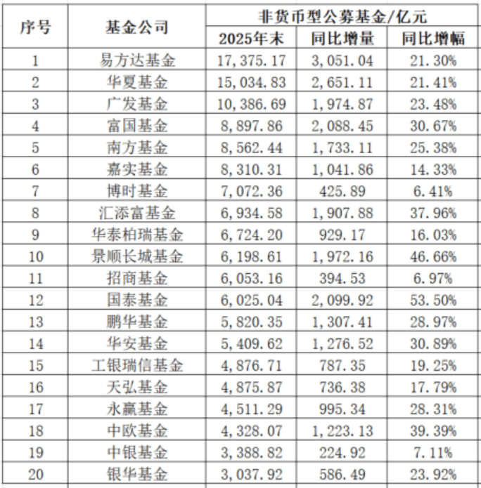 截至2025年末,非货币型基金管理规模Top10榜单与总管理规模Top10榜单相比,除前三名排名保持一致,其余各不相同,行业竞争激烈。其中,富国基金以8897.86亿元位列第四,南方基金(8562.44亿元)、嘉实基金(8310.31亿元)、博时基金(7072.36亿元)、汇添富基金(6934.58亿元)分列五至八位,华泰柏瑞基金和景顺长城基金分别以6724.2亿元、6198.61亿元跻身前十,规模均超6000亿元。