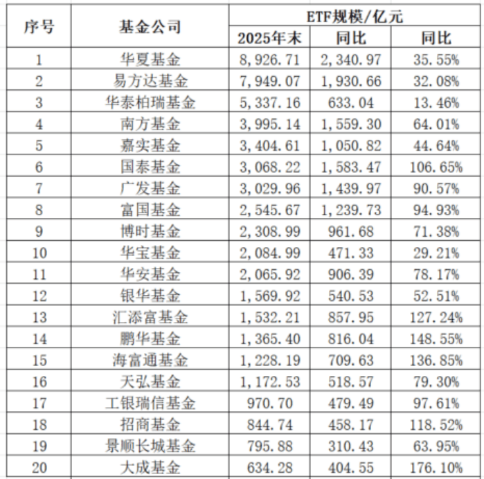 在这场ETF竞赛中,华夏基金规模领跑。Wind数据显示,截至2025年末,华夏基金ETF管理规模继续占领行业第一,达8926.71亿元,全年规模增长超2000亿元,增幅达35.55%。易方达基金以1930.66亿元的增量紧随华夏基金之后,增幅32.08%;总规模位列第二,达7949.07亿元。两家机构共同构成ETF第一梯队,合计市场份额占比达29%。