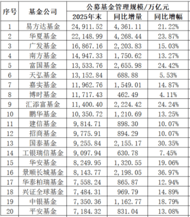 随着公募基金2025年第四季度报告披露收官,全行业最新管理规模排名出炉。Wind数据显示,2025年末,易方达基金以2.49万亿元(ETF使用最新场内规模,下同)管理规模蝉联第一,华夏基金以2.21万亿元紧随其后,成为业内仅有的两家管理规模超2万亿的公募机构。同时,公募基金管理规模Top10门槛跃升至万亿元,广发基金、南方基金、富国基金等8家机构规模均超万亿,头部效应持续强化。