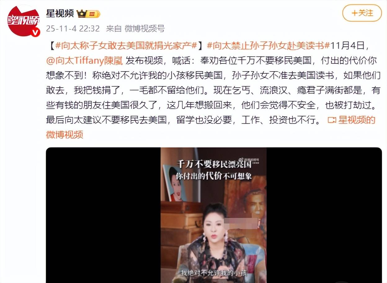 视频里,她态度坚决地说:“我绝对不允许我的子女移民美国,孙子孙女也不准去美国读书。谁要是违反,我就把家产都捐了,一分不留!”