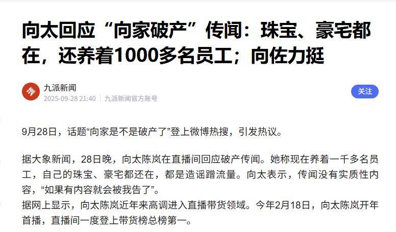 今年九月,甚至有人猜测“向家是不是破产了”,话题还上了热搜。面对这些质疑,向太没有回避。